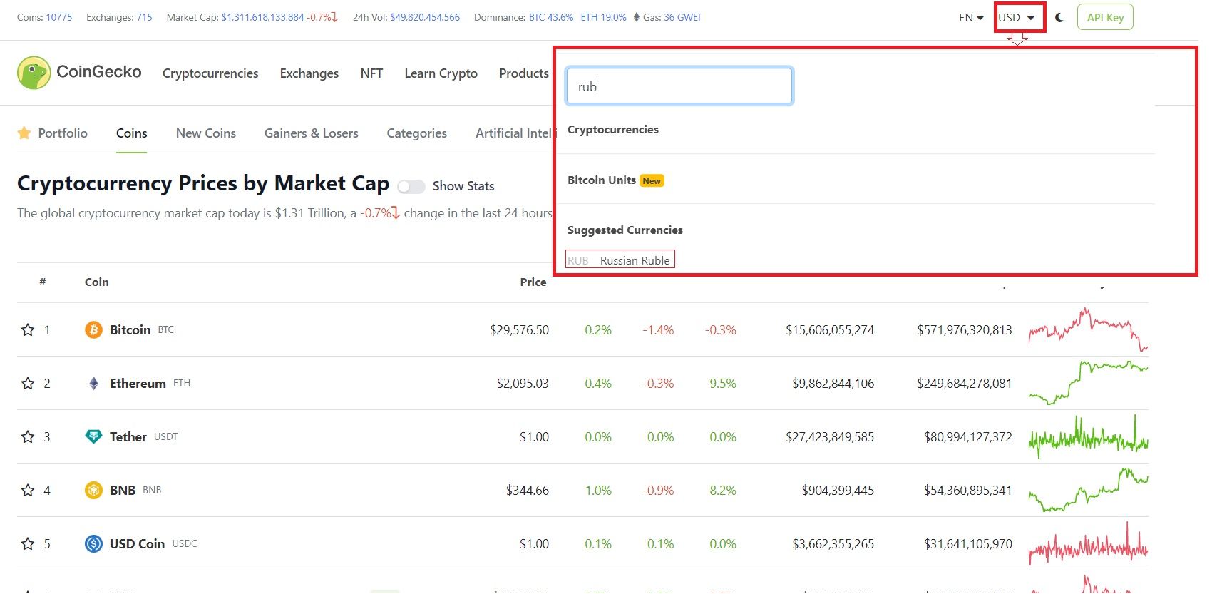 Также конвертировать токены в рубли можно на популярном агрегаторе данных о рынке цифровых активов CoinGecko. Для этого в настройках платформы нужно выбрать национальную валюту РФ, как это показано на скрине ниже: