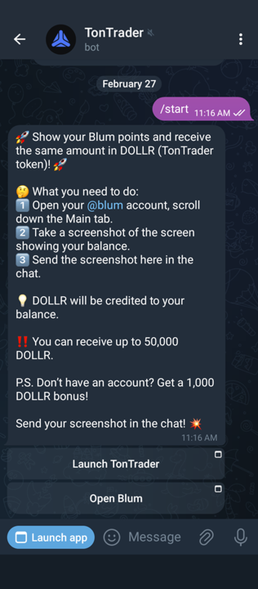 - Пользователи могут получить DOLLR, равный количеству их поинтов Blum, через верификацию скриншота.