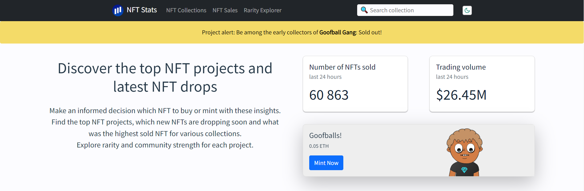 NFT Stats – другая платформа-агрегатор данных о рынке невзаимозаменяемых токенов. При помощи площадки можно получить статистику по различным тематическим проектам. Например, NFT Stats помогает отслеживать продажи невзаимозаменяемых токенов.