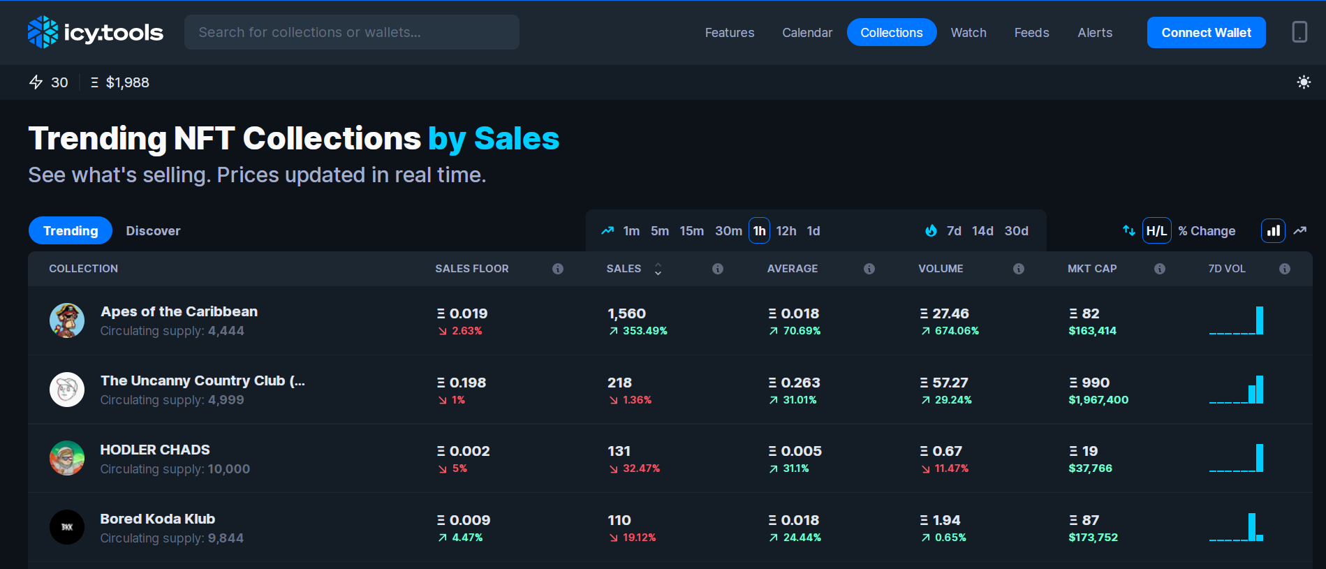 Icy.tools – это платформа для отслеживания активности на рынке невзаимозаменяемых токенов. Встроенные рейтинги площадки помогают ознакомиться с трендовыми и набирающими популярность проектами. На Icy.tools можно составить список интересующих коллекций и кошельков, чтобы оперативно получать о них информацию.