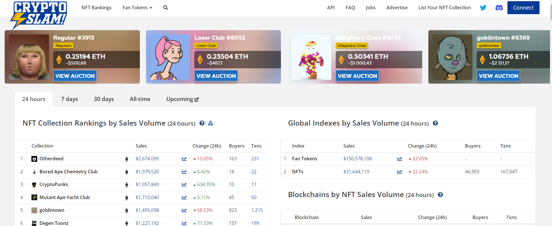CryptoSlam – еще один популярный агрегатор данных о рынке невзаимозаменяемых токенов. Платформу можно использовать, например, для анализа торговых объемов на рынке NFT, выявления самых популярных коллекций цифровых активов и отслеживания дат выпуска новых токенов