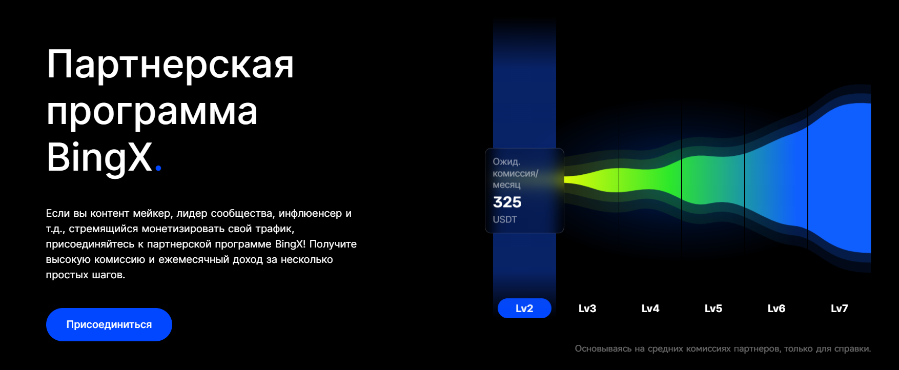 Платформа начинает выплачивать деньги, когда месячный торговый объем рефералов достигнет 100 000 USDT.