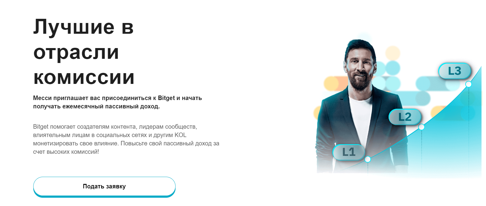 Криптобиржа Bitget предлагает принять участие в глобальной реферальной программе, амбассадором которой выступает футболист Лионель Месси. Максимальный уровень дохода — 50% от комиссий аффилиатов.