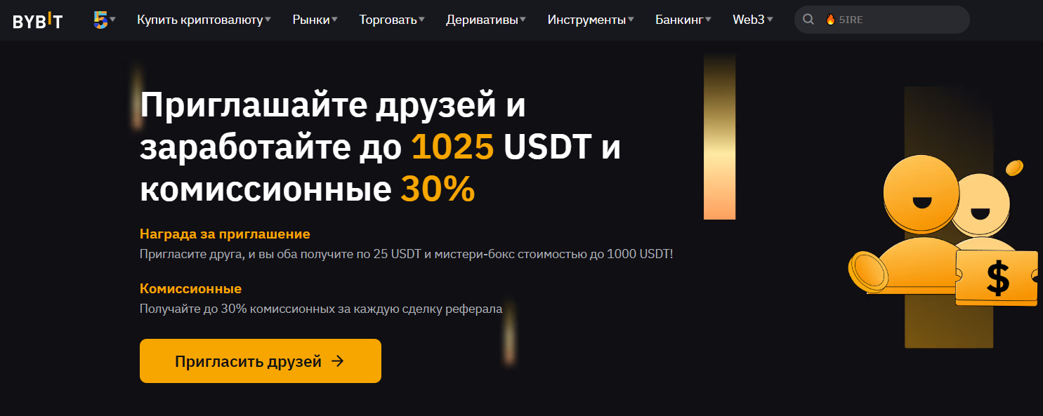 На реферальной программе Bybit можно зарабатывать 30% от комиссий, которые сгенерировали привлеченные пользователем клиенты. Также торговая платформа предлагает дополнительные бонусы в USDT.