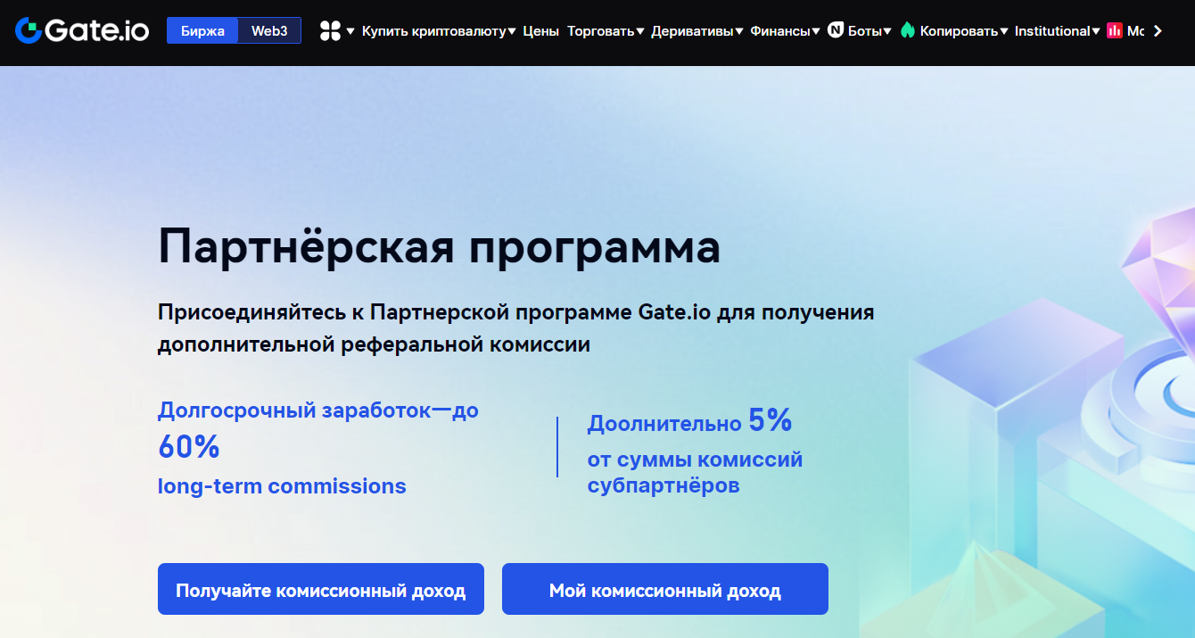 | 6. Gate.io | До 60% от комиссий аффилиатов + 5% от комиссий субпартнеров |