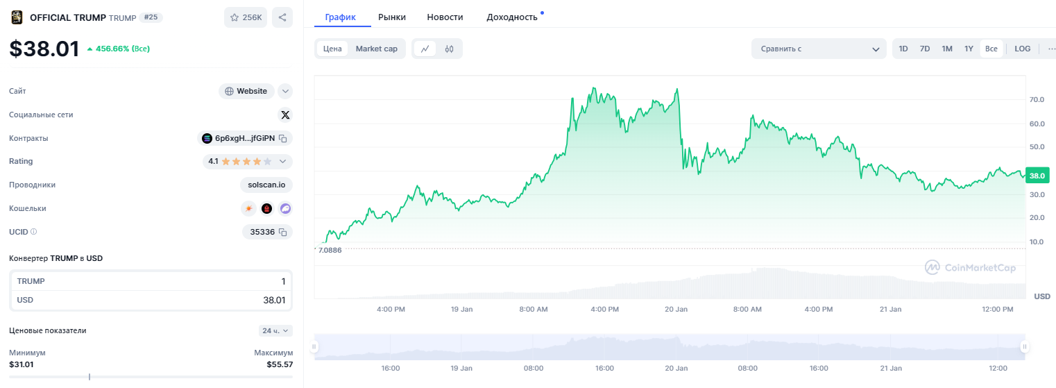 По состоянию на момент написания обзора, криптовалюта Трампа находится на 25 строчке рейтинга капитализации ресурса CoinMarketCap. $TRUMP цена — $38,01. 19 января 2025 года в моменте коин Трампа доходил до $75,35.