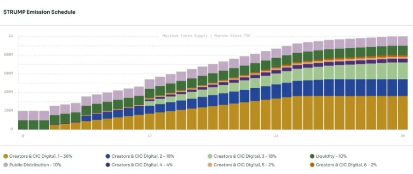 Эмиссия коина Трампа ограничена. Всего будет выпущен 1 млрд монет. На старте продаж разработчики разблокировали 200 млн токенов. Остаток будет выпущен в течение 36 месяцев. Вот как выглядит график эмиссии криптовалюты Трампа: