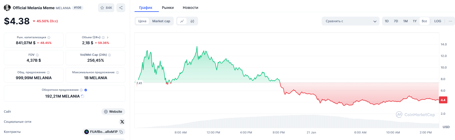 По состоянию на момент написания обзора, криптовалюта MELANIA находится на 106 строчке рейтинга капитализации ресурса CoinMarketCap. Монета торгуется по $4,38. Максимум стоимости MELANIA зафиксирован 20 января на уровне $13,73.
