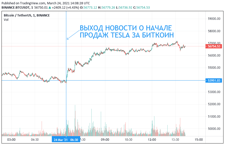 - В этот же день он узнал, что Tesla официально объявила о старте продаж авто за биткоин. Зная, что рынок позитивно отреагировал на новость об инвестициях компании в BTC, учитывая перспективную картину технического анализа, он принимает решение о покупке криптовалюты.