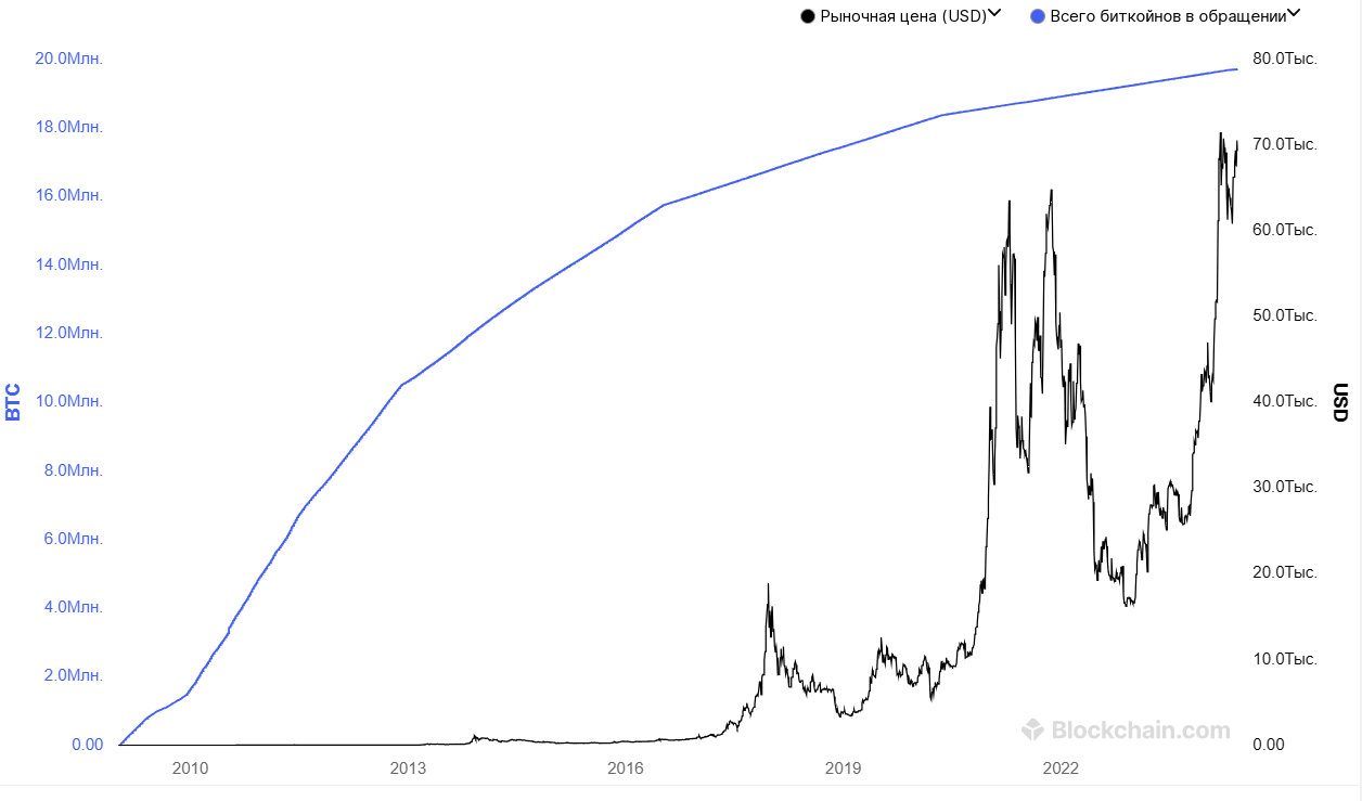 | 2024 год | В январе состоялся долгожданный запуск спотовых биткоин-ETF в США. На фоне события криптовалюта впервые в истории обновила абсолютный максимум до халвинга. В апреле 2024 года в сети BTC состоялся четвертый по счету халвинг. Криптовалюта встретила событие близ $63 000. |