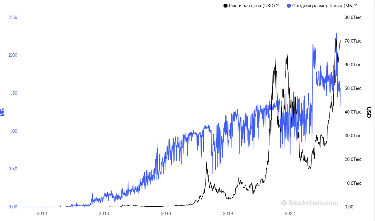Их размер меняется в зависимости от потребностей сети, но случае с биткоином, блок не может превышать 4 мегабайт. На практике же показатель редко достигает 1 мегабайта.