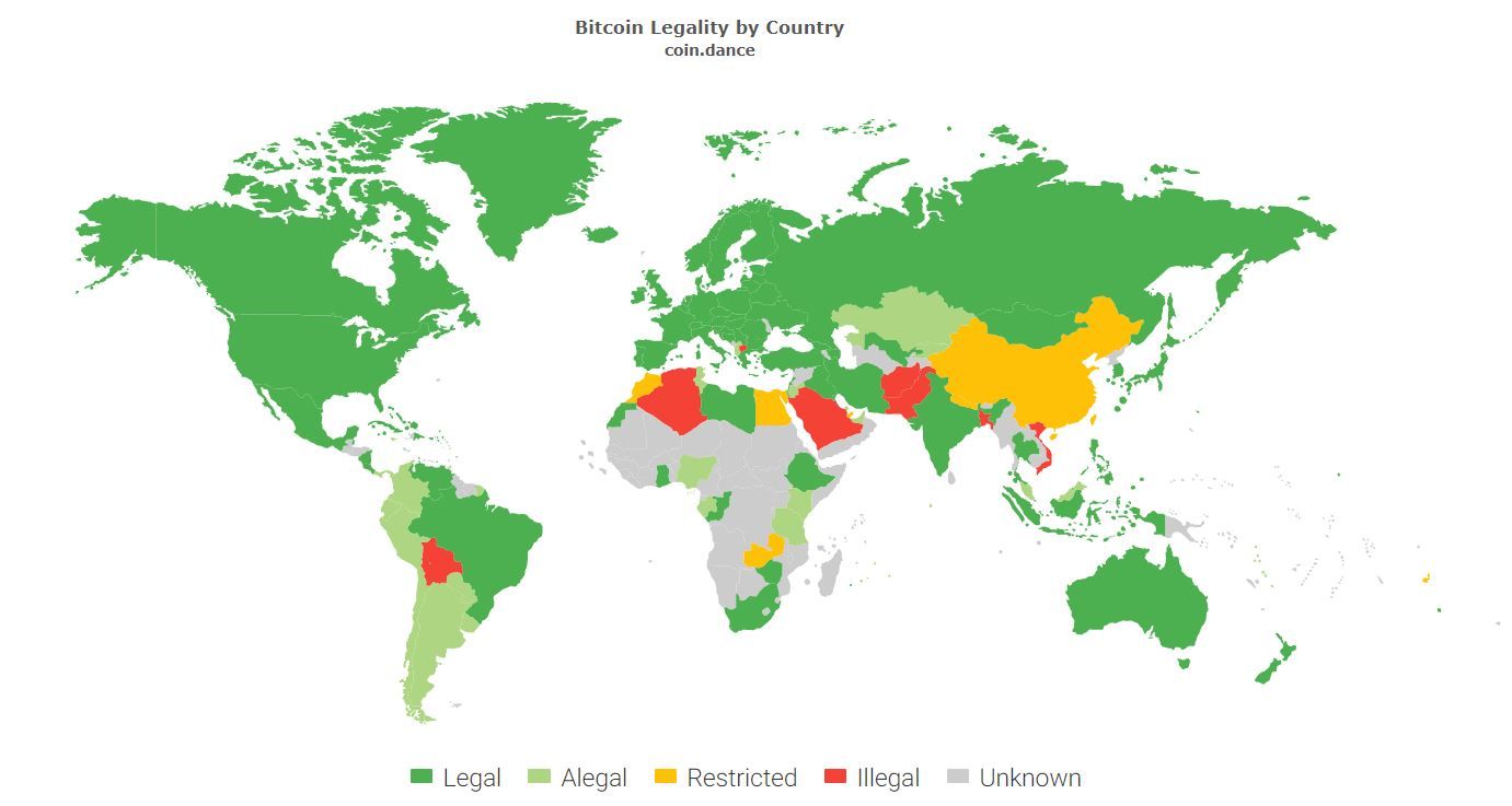 Несмотря на регулярное появление новостей о запретах в отношении рынка цифровых активов, карта легальности биткоина продолжает окрашиваться в зеленый цвет (зеленым отмечены страны, в которых BTC легален).