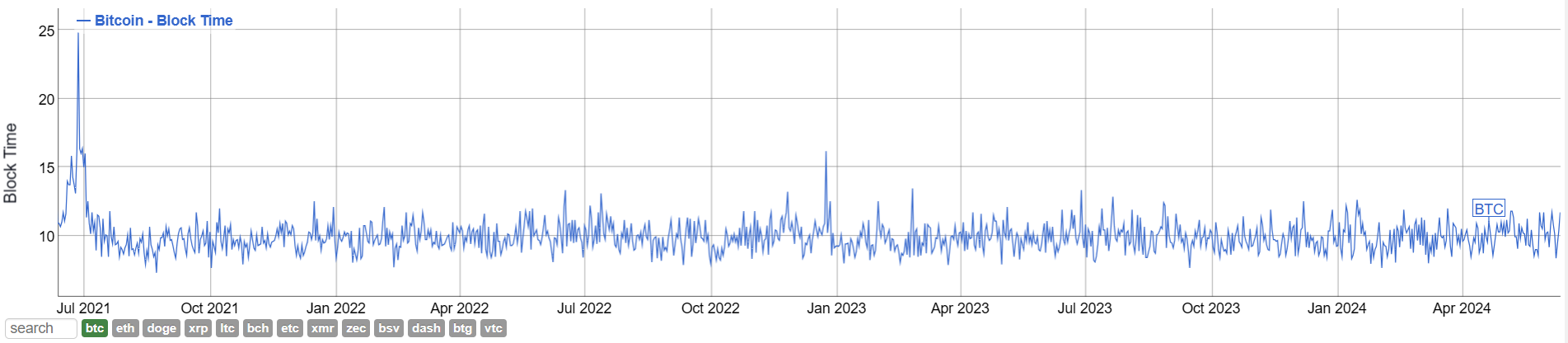 Время формирования блока также может несущественно меняться, поскольку показатель подстраивается под запросы сети. При этом он всегда стремится к усредненному значению – 10 минутам. Например, в течение года минимальное время закрытия блока составило 7,3 минуты, максимальное – 15,6 минут.