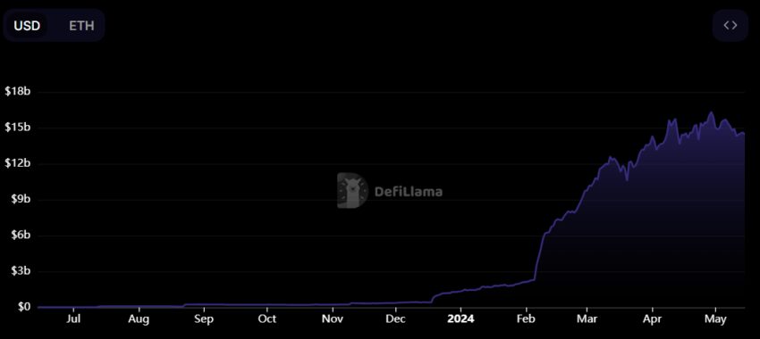 В настоящее время EigenLayer — второй по величине протокол в секторе децентрализованных финансов (DeFi). Проект появился в январе этого года. Всего за несколько месяцев общая стоимость заблокированных средств (TVL) площадки достигла $14,442 млрд, согласно DefiLlama.