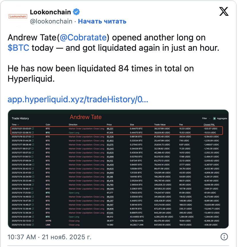 Фирма по блокчейн-аналитике отметила резкое снижение прибыли этого трейдера на платформе Hyperliquid всего за 10 дней. Главной причиной стали массивные длинные позиции с плечом в ETH и XRP. Сегодня этот инвестор снова подвергся принудительному закрытию сделок.