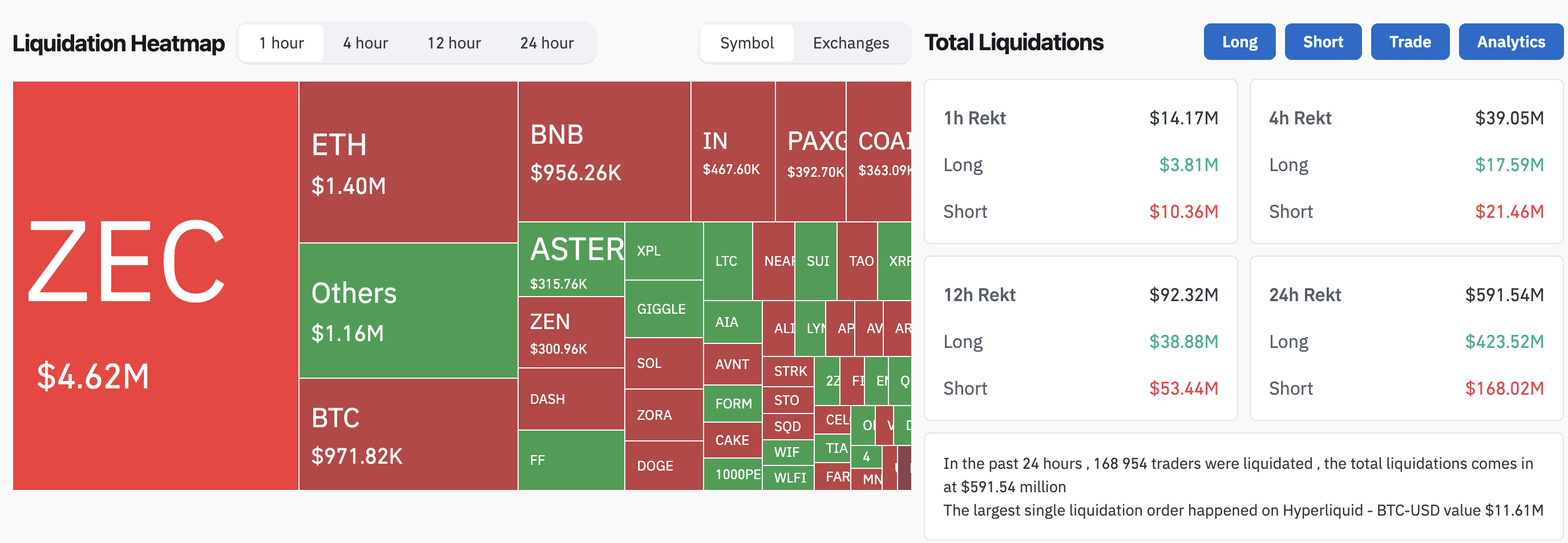 SponsoredЗа минувшие сутки биткоин подешевел примерно на $4 000, вызвав волну ликвидаций на рынке криптовалют. За последние 24 часа были ликвидированы позиции на общую сумму более $500 млн, при этом на долю длинных позиций пришлось более 70% от общего объема ликвидаций ($424 млн). Самый крупный ордер — на $11 млн в паре BTC-USD — был ликвидирован на платформе Hyperliquid.
