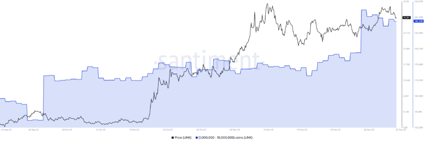 О росте спроса свидетельствует и поведение китов. В период с 28 по 29 ноября они приобрели более 9,6 млн токенов LINK на сумму около $143,3 млн.