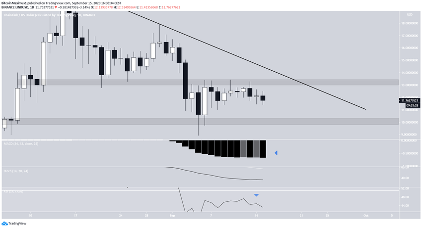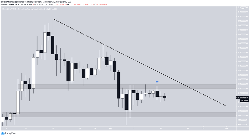 Криптовалюта ChainLink (LINK) снижается, следуя за линией нисходящего сопротивления с момента достижения максимума 16 августа. До тех пор, пока котировки не пробьют эту линию, динамика монеты считается коррективной.
