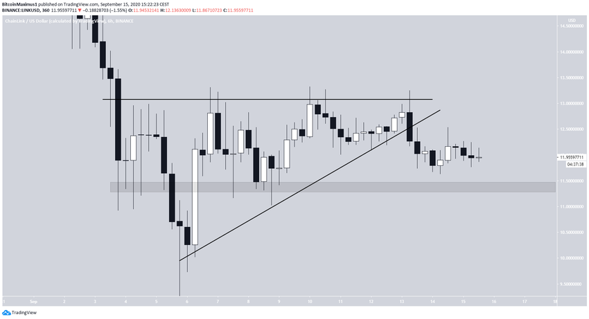 С момента публикации твита цена пробила этот треугольник вниз и уже приближается к промежуточной поддержке $11.40. Альткоин совершил медвежий прорыв бычьего паттерна, что повышает вероятность дальнейшего отступления в направлении поддержки $10, которая упоминалась выше.
