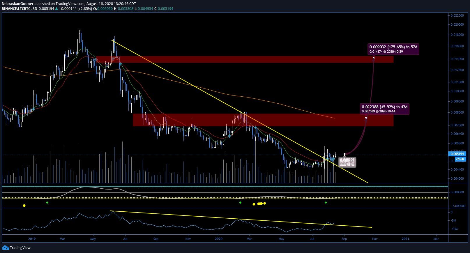 Он поделился своими мыслями на этот счет и результатом технического анализа в своем твиттере. В частности, эксперт отметил, что пара LTC/BTC пробил ключевое сопротивление долгосрочного медвежьего тренда на высоком объеме и сформировал сигнал на покупку.