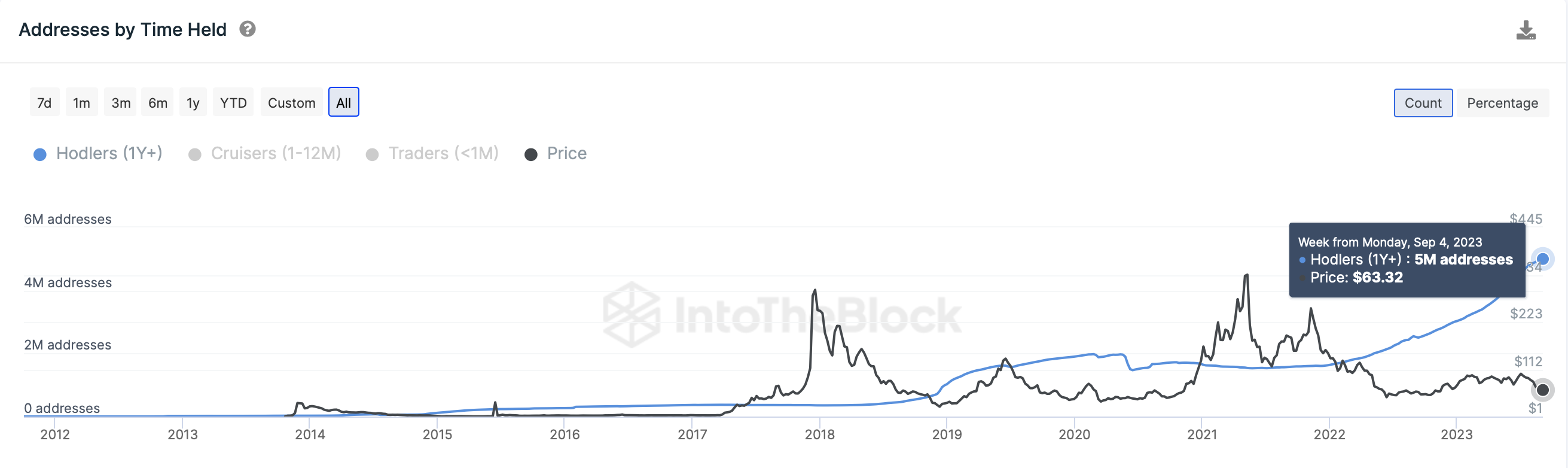 Согласно данным аналитической платформы IntoTheBlock, на этой неделе число долгосрочных держателей LTC достигло нового исторического максимума в 5 млн адресов.