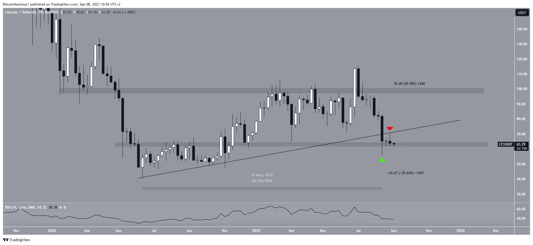 Цена Litecoin (LTC) упала ниже долгосрочной восходящей линии поддержки и рискует потерять ключевую горизонтальную поддержку на отметке 60 долларов.