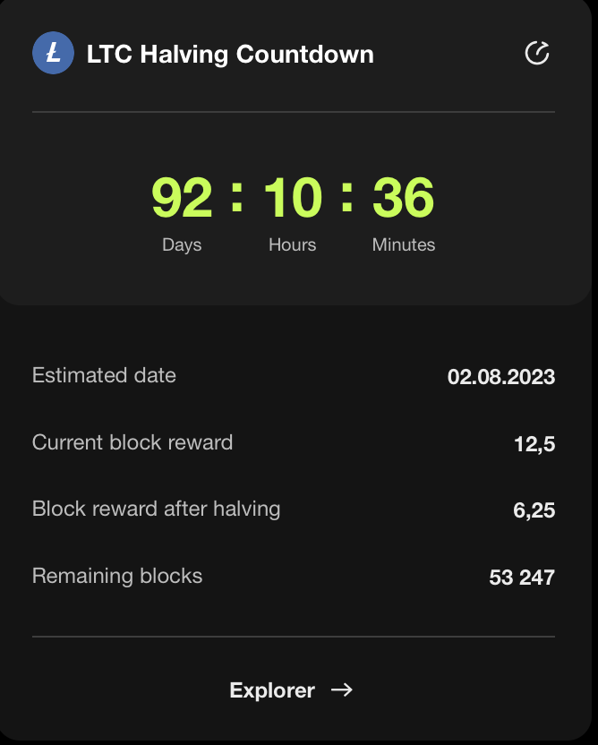 До халвинга Litecoin остается все меньше времени: по данным аналитической платформы OKlink, он придется на 3 августа 2023 года. После халвинга вознаграждение майнеров за добытый блок будет снижено с 12,5 до 6,25 LTC.