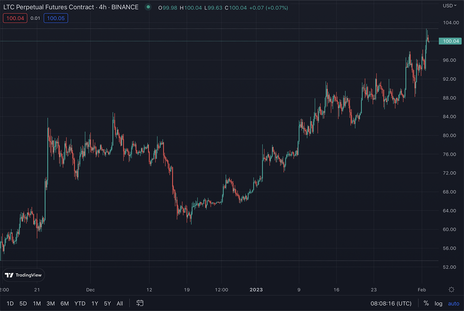 Во время утренней торговой сессии цена Litecoin достигла отметки $102. На момент публикации LTC торгуется на уровне $100, прибавив за день 3,5%.