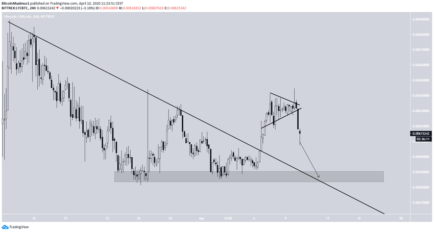 С момента публикации твита LTC успел пробить треугольник и теперь в краткосрочной перспективе цена может повторно протестировать и недавно пробитую нисходящую линию сопротивления, и зону поддержки ₿0.0058, которая способна затормозить снижение с последующим рывком к следующей поддержке.