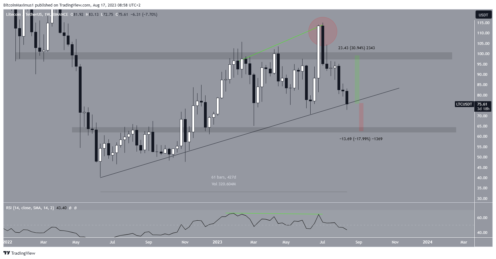 Технический анализ недельного таймфрейма дает однозначно медвежий прогноз. Litecoin не смог удержать июльский прорыв и подтвердить важный уровень сопротивления в качестве поддержки: цена актива ненадолго поднялась выше отметки $100 (на графике этот момент отмечен красным кругом), но вскоре снова опустилась ниже нее.