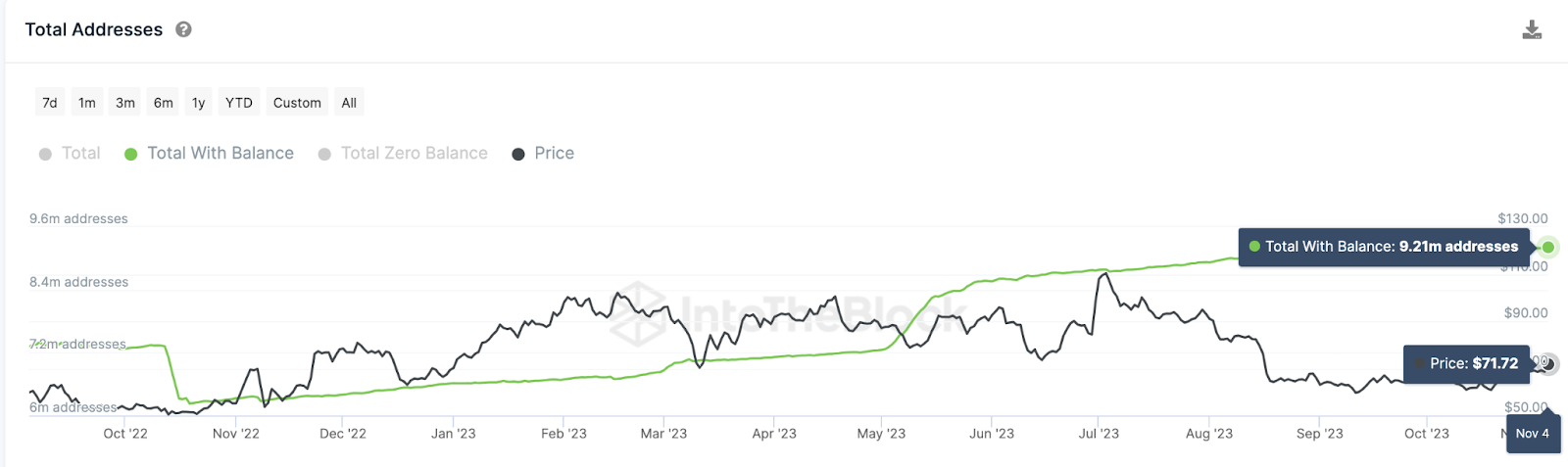 Согласно показаниям ончейн-метрик, восстановление было вызвано в основном устойчивым ростом спроса в сети. Аналитическая платформа IntoTheBlock сообщает, что с начала второго полугодия 2023 года количество кошельков LTC с ненулевым балансом увеличилось на 44 000 – до 9,21 млн.