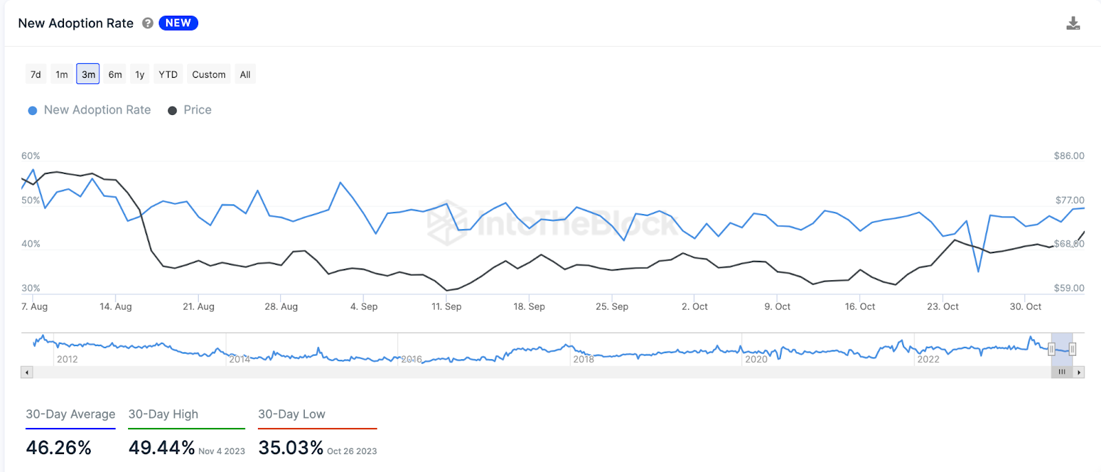 SponsoredПо данным IntoTheBlock, 4 ноября сделки совершили 49,44% недавно зарегистрированных адресов. Это значительно превышает средний показатель за 30 дней, равный 44,26%.