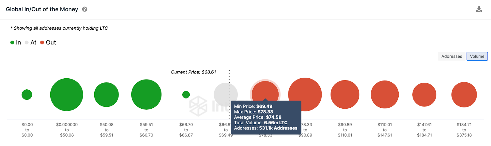 Данные Global In/Out of the Money, отражающие исторические тенденции покупок держателей LTC, подтверждают этот прогноз. Они показывают, что отметка $75 на данный момент является наиболее значимым сопротивлением.