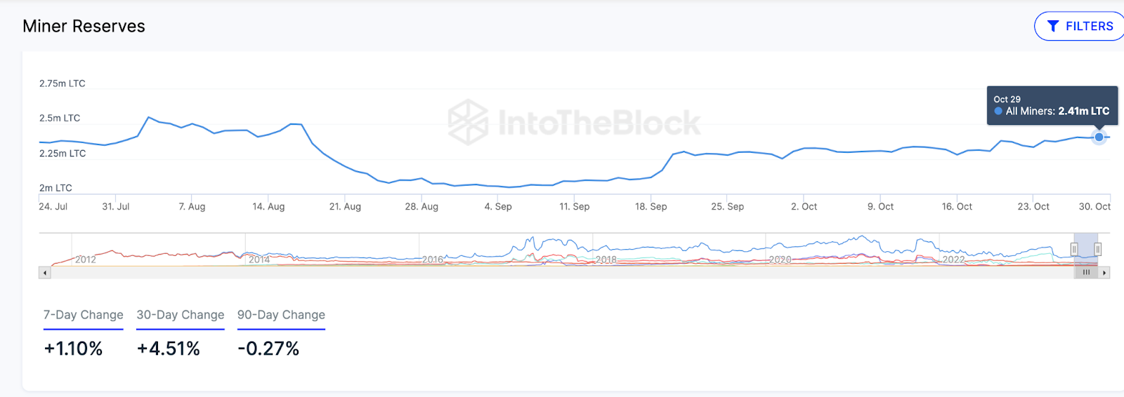 На приведенном ниже графике IntoTheBlock видно, что в период с 6 сентября по 31 октября их совокупный баланс увеличился с 2,05 млн до 2,41 млн монет. Если майнеры приобретут еще 140 000 Litecoin, он вернется к предшествовавшим халвингу значениям.