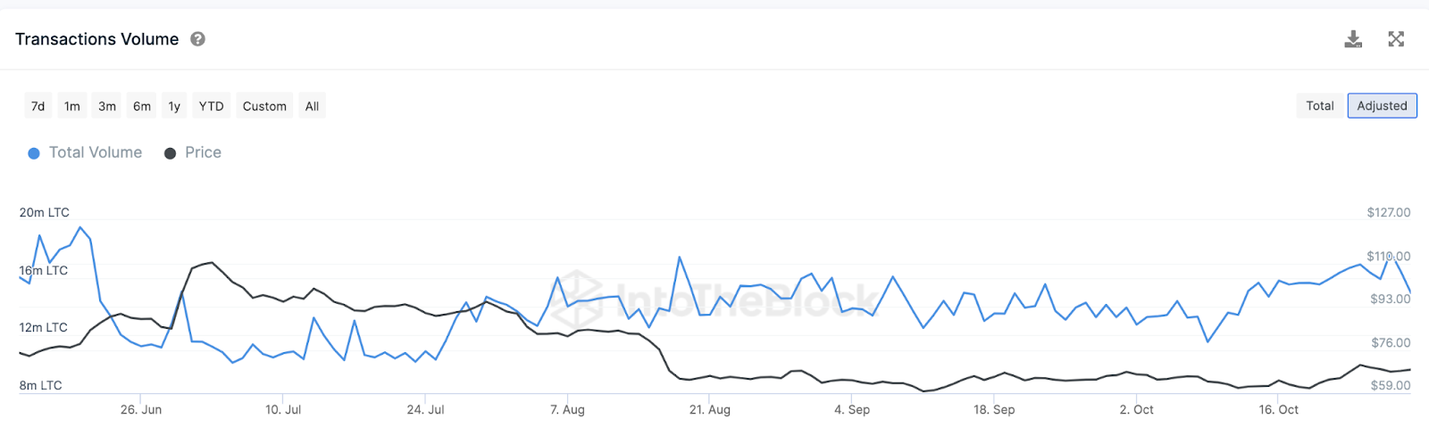 Рост объема транзакций LTC является вторым важным индикатором, указывающим на возможность роста. Как показано на графике ниже, 27 октября объем торгов Litecoin вырос до 17,8 млн монет.