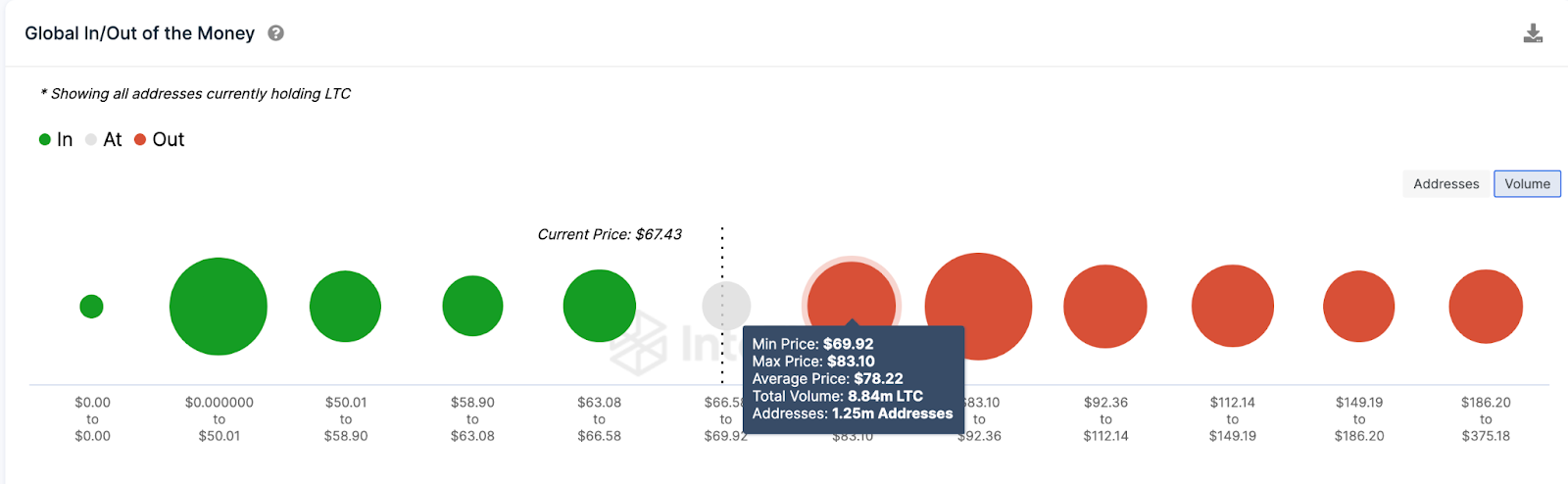В пользу этого прогноза говорят и данные Global In/Out of Money Around Price (GIOM), отражающие распределение цен покупки среди нынешних держателей актива. Даже если быки соберутся с силами, на их пути встанут 1,25 млн адресов, которые приобрели 8,84 млн LTC по средней цене $78, и еще одна стена из 1,66 млн кошельков с балансом 14,81 млн монет, купленных на отметке $88. Прорыв такого мощного сопротивления выглядит маловероятным.