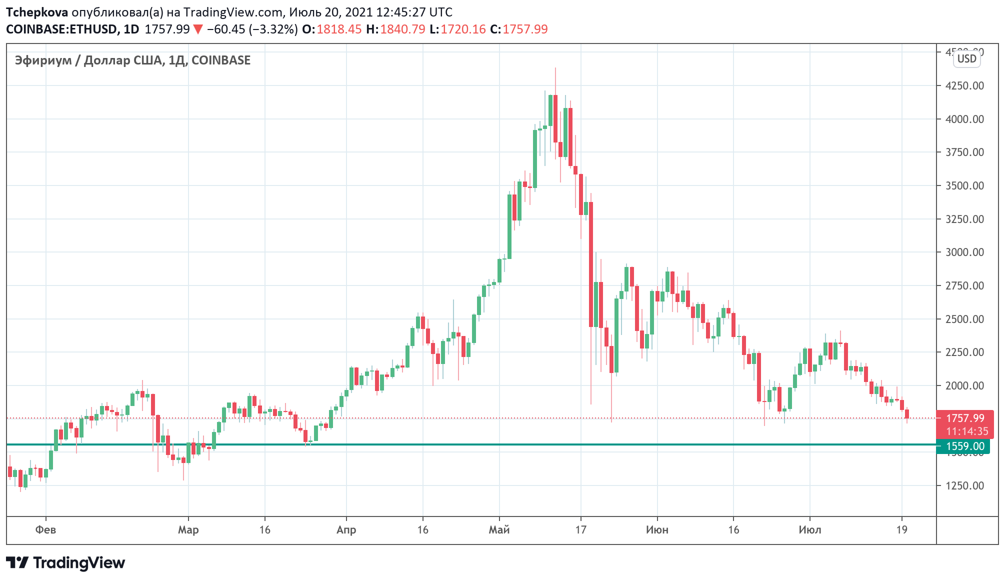 Основатель EthHub Энтони Сассано мрачно пошутил, что «к моменту реализации EIP1559 ETH будет стоить $1559». Если исходить из текущих цен, это всего лишь еще одно падение на 11%. Учитывая то, что биткоин пробил долгосрочную поддержку и психологически значимый уровень на $30 000, такое развитие событий вполне вероятно.