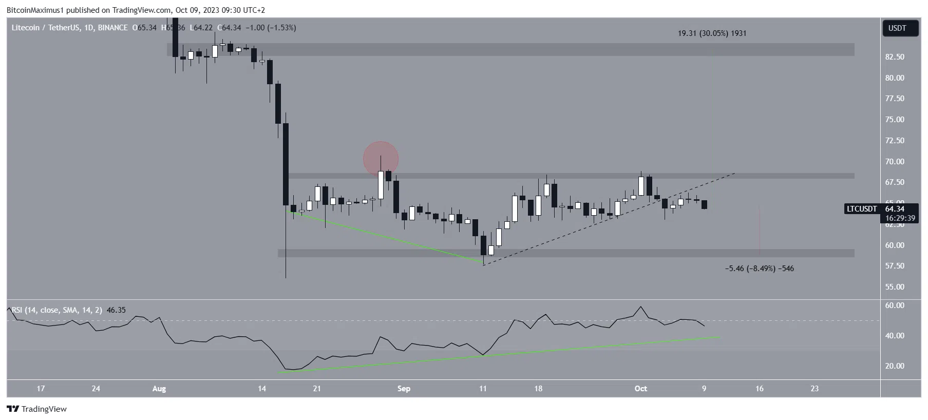4 октября Litecoin отбился от восходящей линии тренда поддержки, что свидетельствует о завершении предыдущего восходящего движения. Реакция на второстепенную область сопротивления $68 также была медвежьей. Цена актива отклонилась выше нее в августе, а затем упала ниже восходящей линии поддержки.