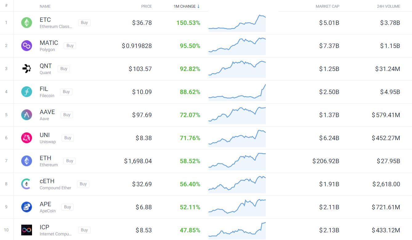 Лучшей криптовалютой июля 2022 года стал Ethereum Classic (ETC). За месяц монета подорожала на 150%.