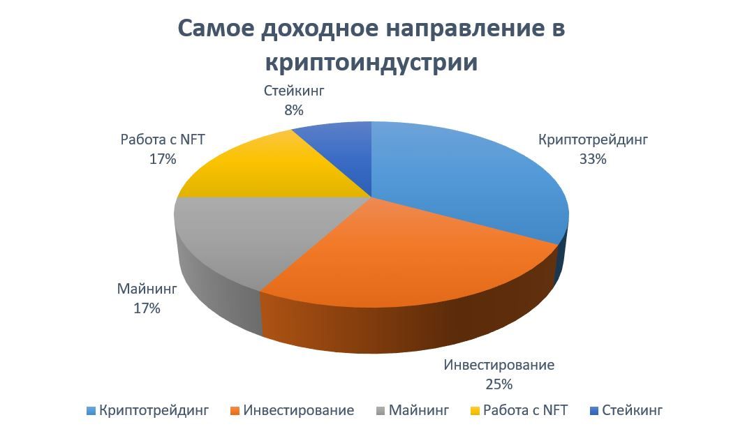 Самым прибыльным видом работы в криптоиндустрии в условиях 2022 года эксперты считают криптотрейдинг. На втором месте расположились инвестиции в цифровые активы.