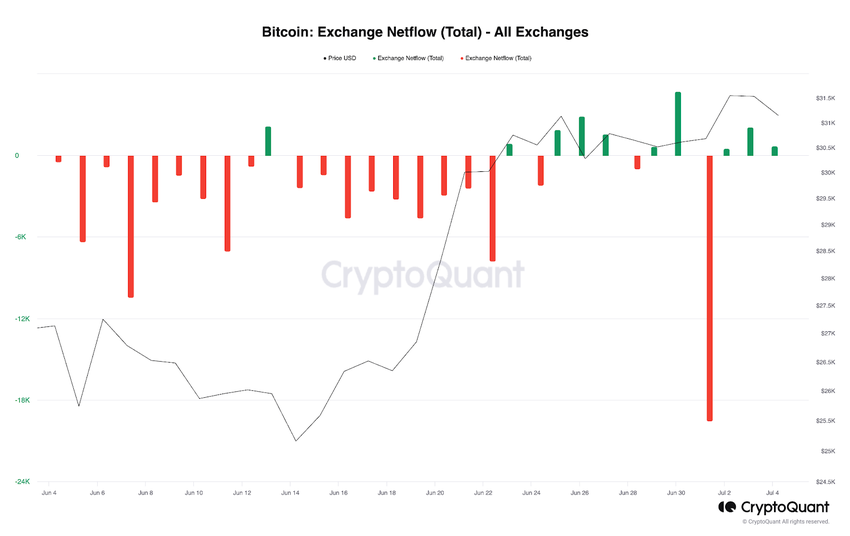 Согласно данным CryptoQuant, за последние 30 дней в криптопространстве чистый отток BTC с бирж преобладал над чистым притоком.