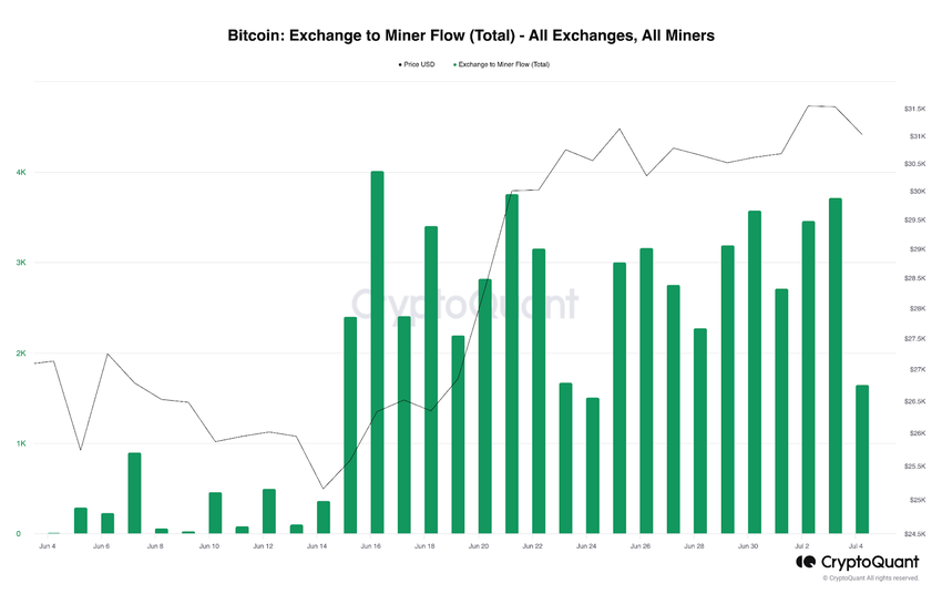 После того, как компания-тяжеловес BlackRock подала заявку на создание спотового биткоин-ETF, цена главной криптовалюты мира выросла более чем на 20%. В конечном итоге потоки биткоинов от майнеров на биржи также резко увеличились. За последние 30 дней майнеры отправили на биржи более 65 000 BTC.