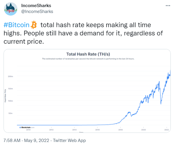 По мнению пользователей, рост хешрейта прямо говорит об уверенности майнеров в восстановлении рыночных котировок. По мнению пользователя @Fiat_vs_Crypto, майнеры биткоина все еще видят долгосрочный потенциал, поскольку они получают вознаграждение в криптовалюте. Рост хешрейта демонстрирует все большее подключение майнеров к сети.