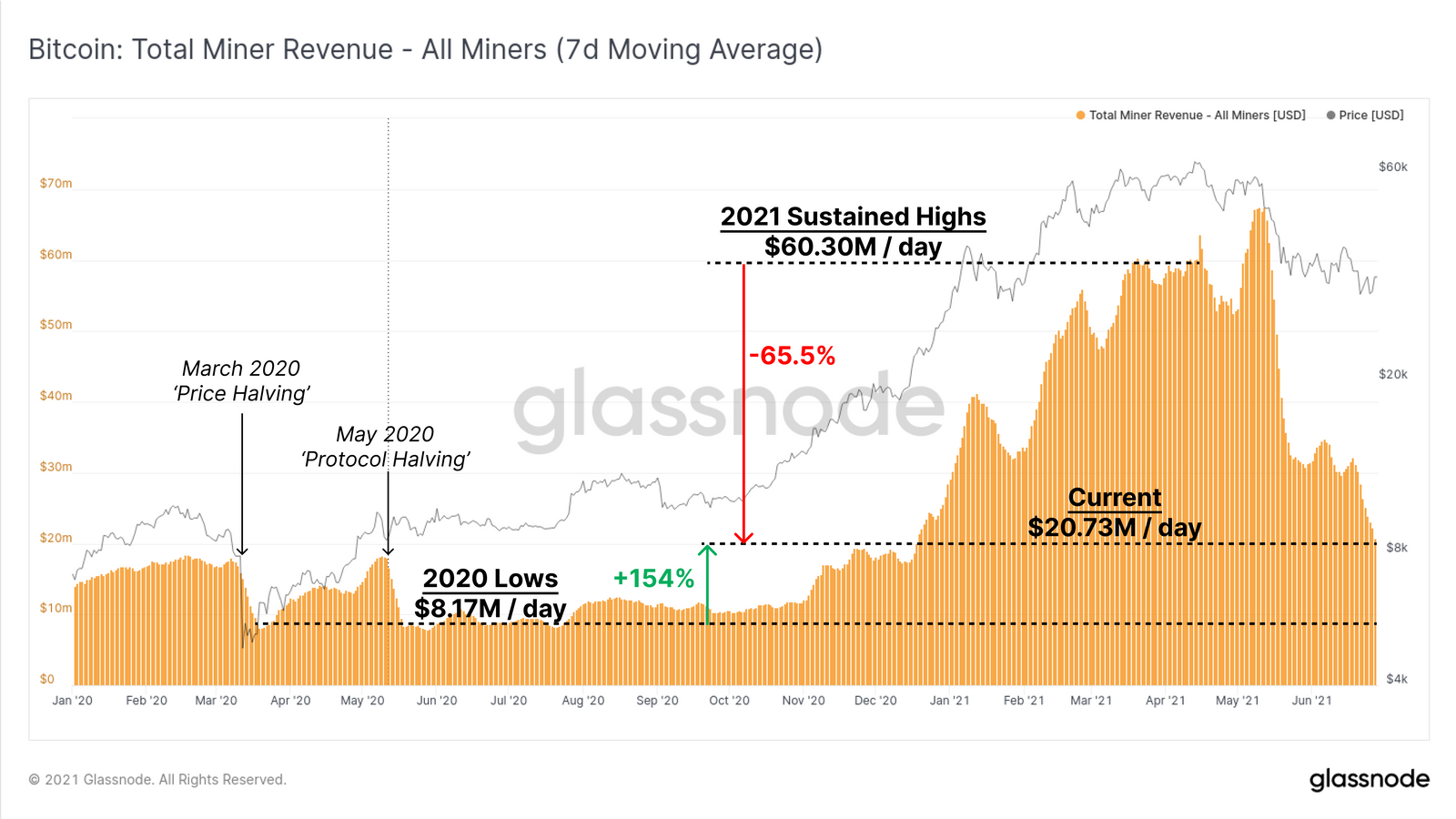 По сравнению с 2020 годом и I кварталом 2021 года давление на цену биткоина со стороны майнеров сейчас заметно меньше, отмечают аналитики. Так, по состоянию на июнь 2021 года, майнеры вывели на биржи в среднем 180-200 BTC в сутки.