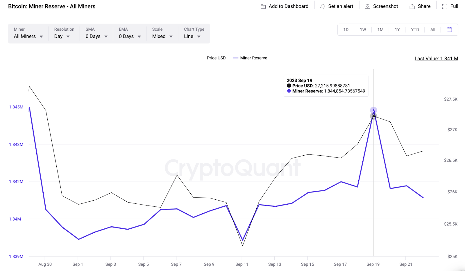 Согласно ее данным, 19 сентября, когда цена BTC превысила отметку в $27 000, совокупные резервы майнеров составляли 1 844 854 BTC. Однако спустя всего 72 часа они продали 3 495 биткоинов, в результате чего баланс снизился до 1 841 350 монет.