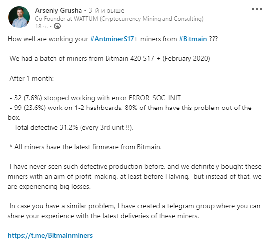 Свое возмущение он также описал в посте на личной странице в Linkedin. По словам Арсения Груши, компания приобрела партию майнеров из Bitmain 420 S17 + (февраль 2020 года), которая оказалась бракованной.