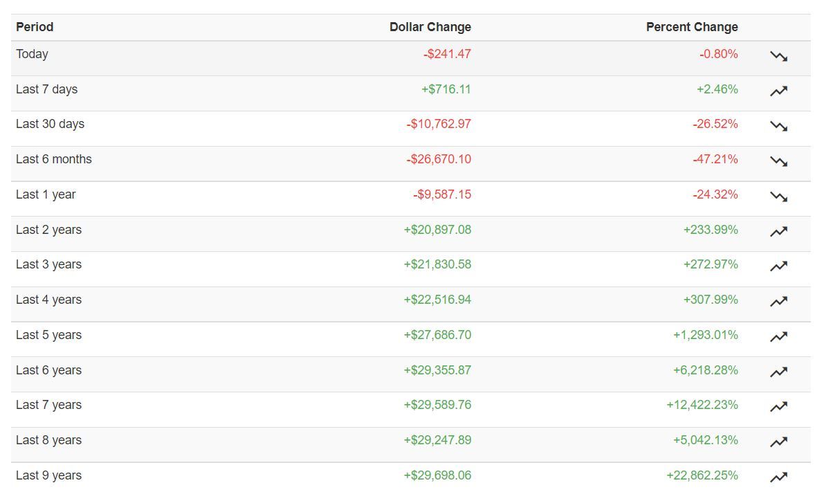 Инвестирование – это процесс закупа актива, как правило, с целью его дальнейшей перепродажи по более высокому ценнику. Статистика движения биткоина (BTC) показывает, что все инвесторы, которые закупились монетами 2 и более лет назад, в плюсе.