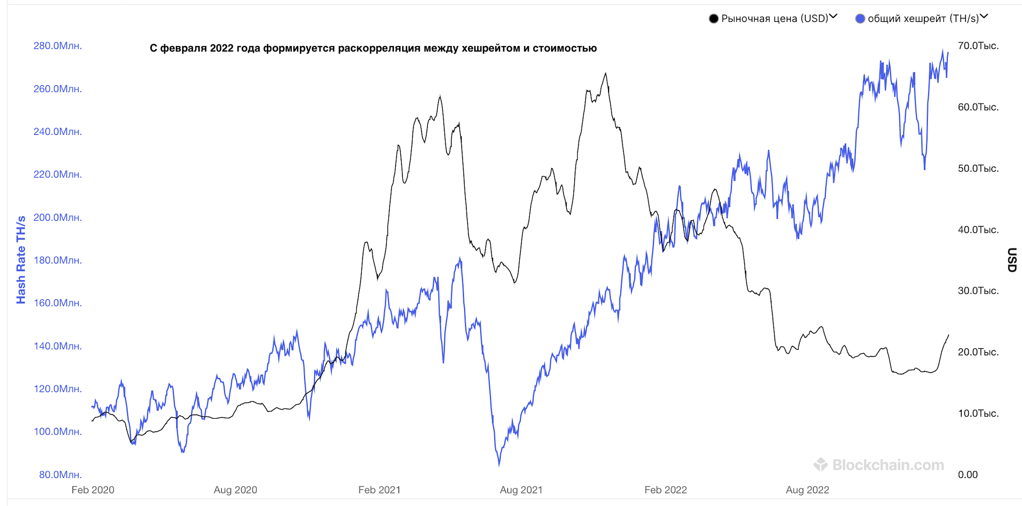 В настоящее время хэшрейт биткоина остается высоким. После непродолжительной коррекции в конце декабря 2022 года показатель возобновил рост и обновил исторические максимумы. На графике видно, что с февраля 2022 года хэшрейт и курс биткоина движутся в разных направлениях.