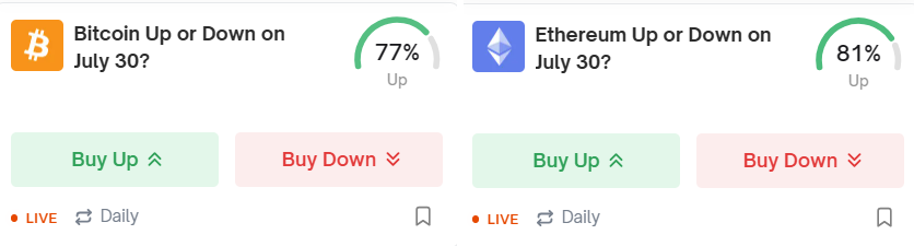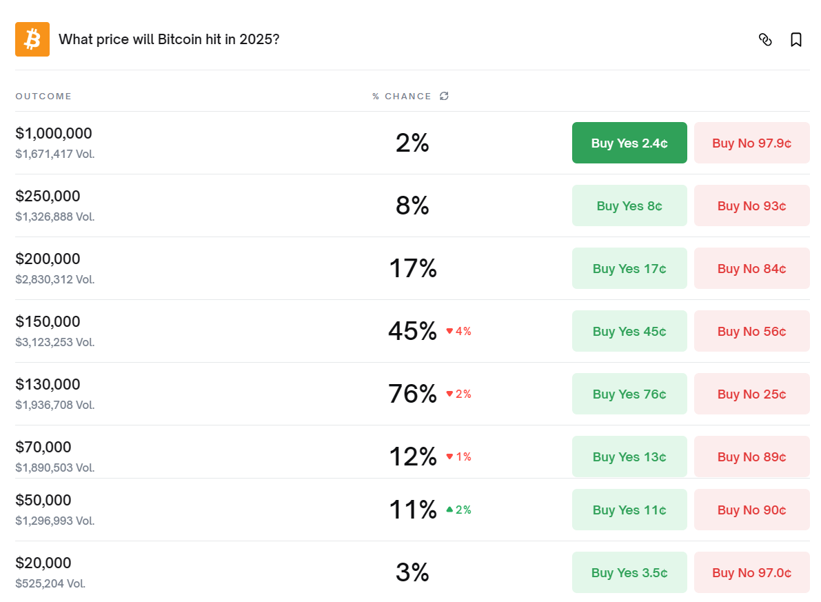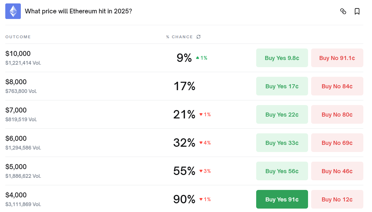 Участники криптосообщества делают ставки на разные прогнозы биткоина и Ethereum на платформе предсказаний Polymarket. На кону стоят деньги. Поэтому прогнозы Polymarket как нельзя лучше отражают реальные ожидания представителей криптоиндустрии