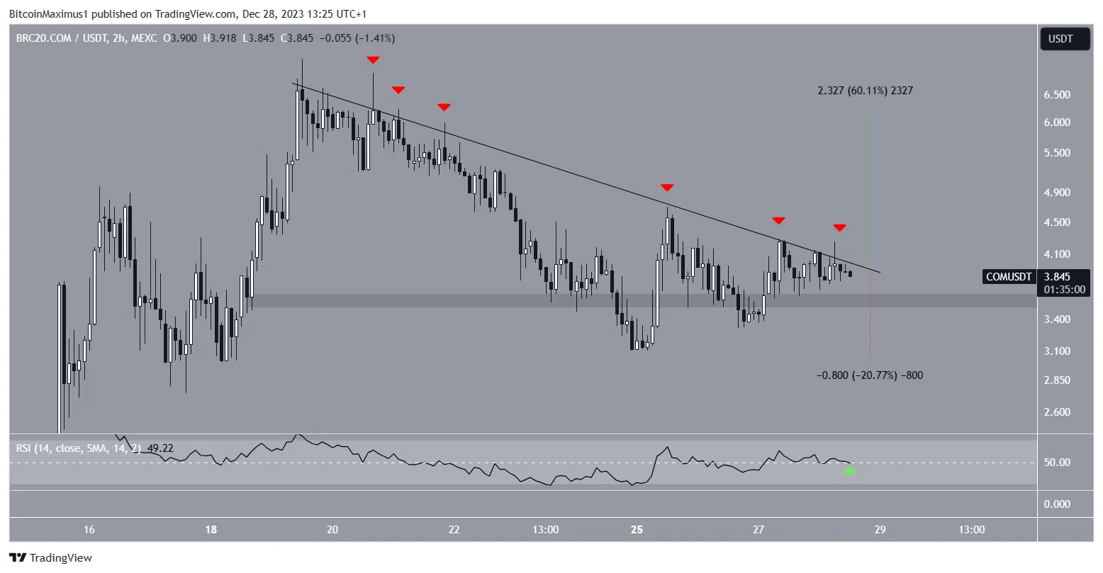 Последним альткоином с потенциалом значительного роста в январе стал BRC20.com. В декабре он предпринял шесть неудачных попыток прорыва нисходящей линии тренда сопротивления. Однако движение цены COM выше горизонтальной области $3,60 и значение RSI выше 50 намекают на то, что седьмая попытка может стать успешной.